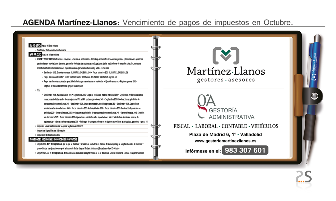 Realización de anuncio de 28 módulos en color para el diario El Norte de Castilla de Valladolid. La idea de la Gestoría Martínez Llanos de Valladolid es informar mediante este tipo de anuncios de las fechas de pagos fiscales que han de realizar las empresas, a modo de nota informativa y por supuesto aprovechar para publicitar sus servicios como gestoría. Esta gestoría administrativa localizada en el centro de Valladolid, en el Nº6 de la Plaza de Madrid , fue fundada en 1957 y es un referente en el sector por su formación continua , servicio y eficiencia en todos los campos en los que están especializados.