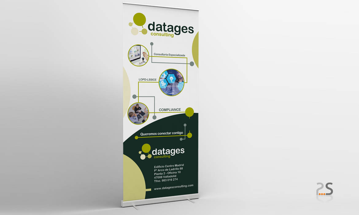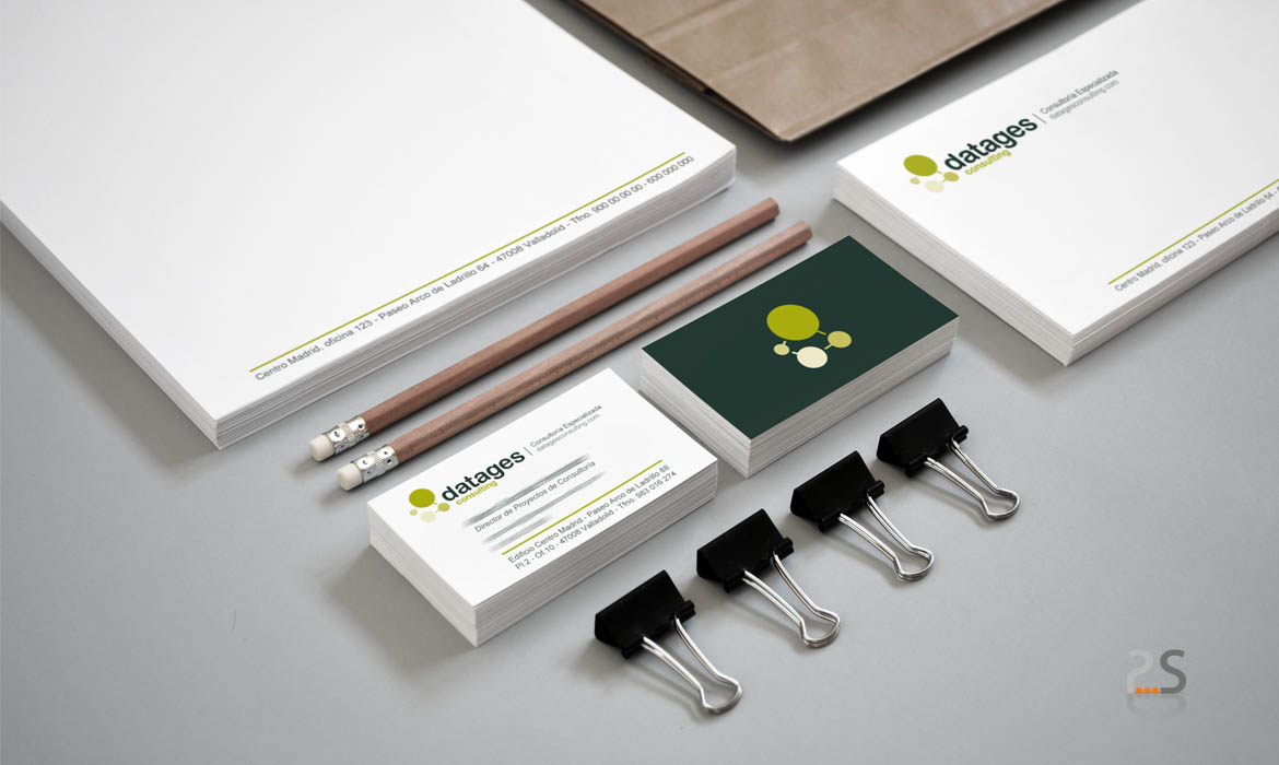 Datages Consulting, empresa líder en formación y asesoramiento sobre LOPD, LSSICE y Compliance, nos encargó el trabajo de restyling de su marca para modernizarla adaptándola a los nuevos tiempos. Se modificaron levemente los colores, utilizando para el nombre un verde muy oscuro y para los círculos tonalidades de un verde mucho más claro. Los círculos que representan las grandes áreas de la empresa, ahora son conectores que al girar conectan entre sí unas áreas con otras, y representan a su vez la idea de conectar también a todo el equipo de Datages con los clientes y empresas que contactan con ellos. La palabra Datages en la marca anterior aparecía en mayúsculas y en una tipografía muy dura, recta y con poco cuerpo. Nosotros optamos por utilizar un texto más grueso, con cuerpo, pero en minúsculas, más cercano, y para ello nos basamos en la tipografía arial rounded de la que tomamos la idea para realizar las letras.